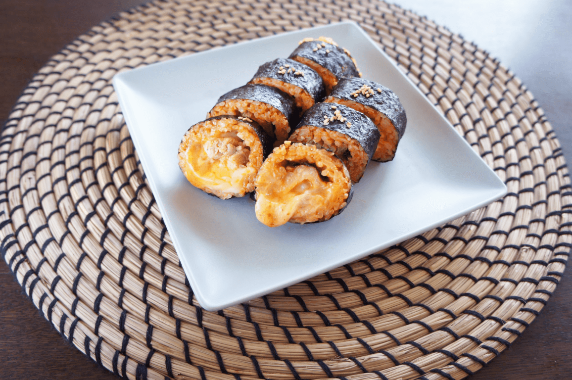 味付けした国産米と韓国のりでナチュラルチーズ、牛肉、白菜キムチ、タッカルビソース、ニラキムチ等を巻きました。