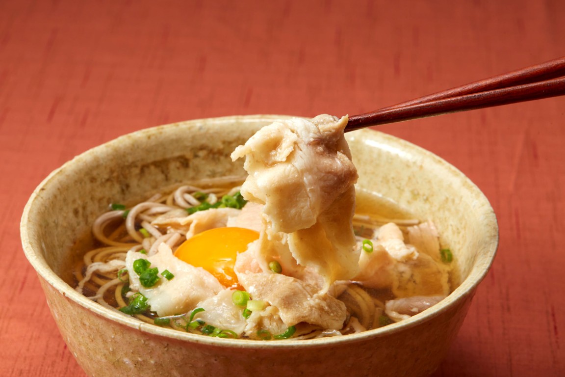 豚バラの柔らかで旨味が強い脂身が口の中で溶けだし、そばの出汁とのハーモニーを楽しめます。