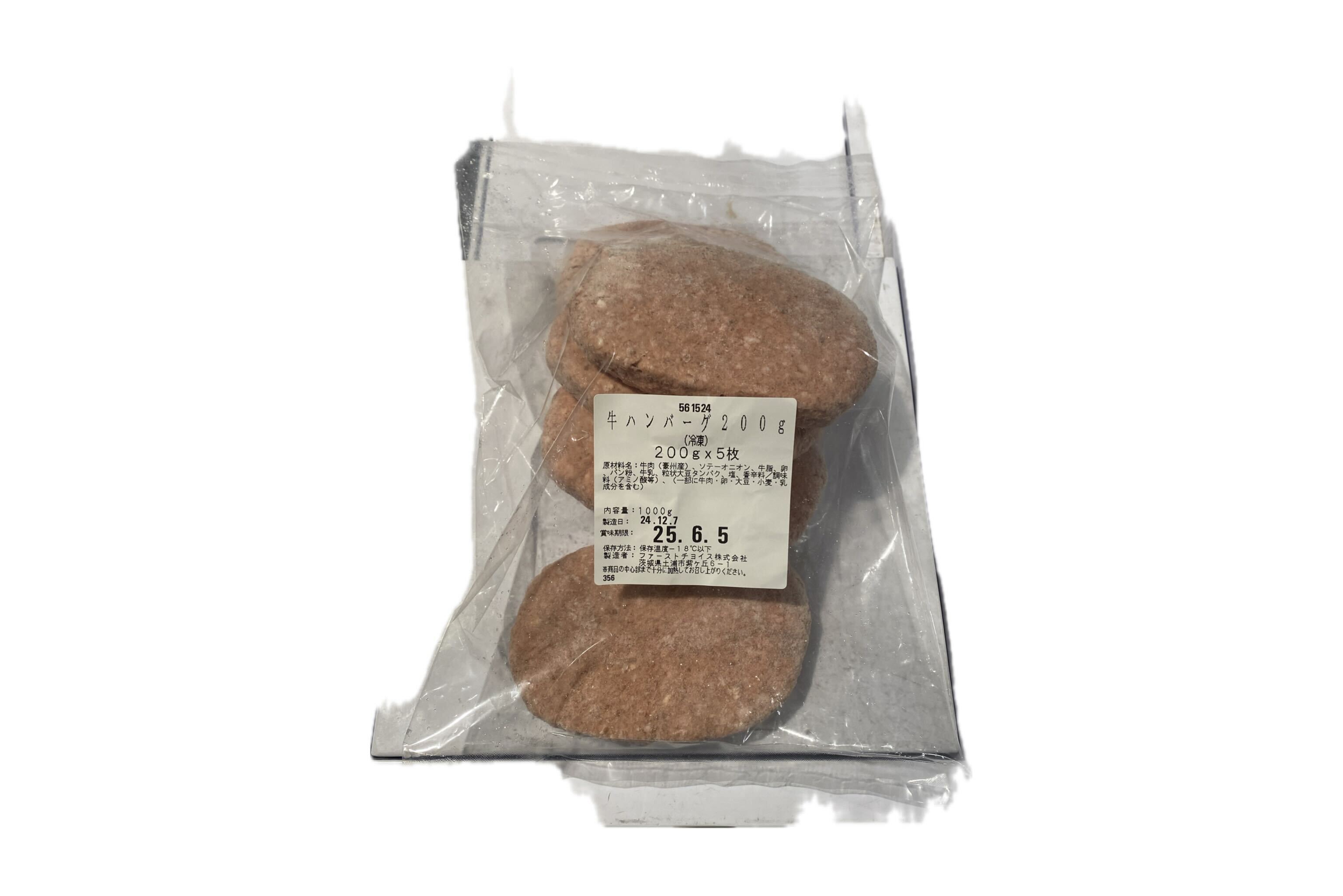 | 原材料 | 牛肉 (豪州産)、 ソテーオニオン、 牛脂、卵、パン粉、 牛乳、 粒状大豆タンパク、塩、香辛料/調味料(アミノ酸等)、(一部に牛肉・卵・大豆・小麦・乳 成分を含む) |