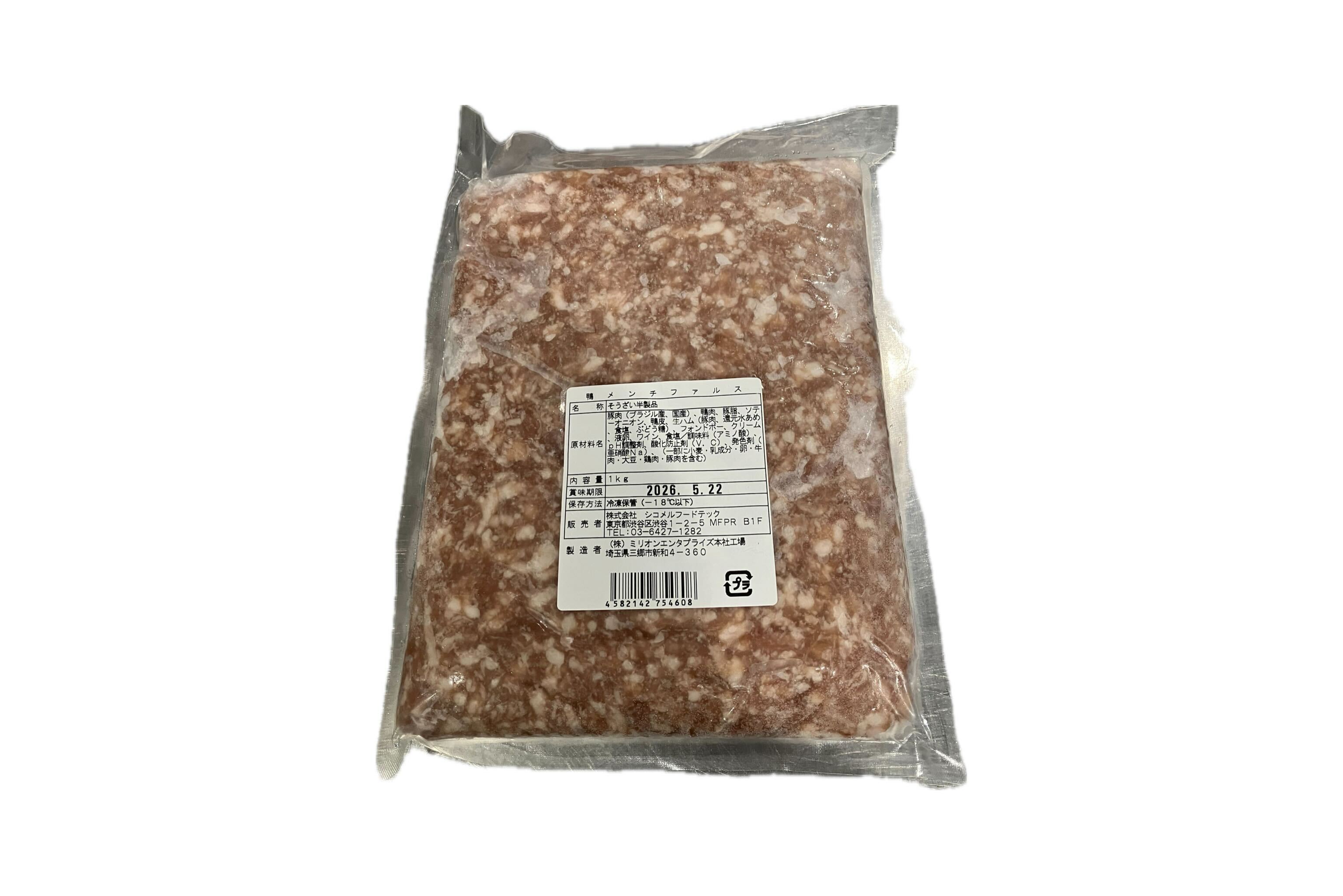 | 調理方法 | 【解凍方法】 冷蔵庫で約8時間完全解凍します。 半解凍だと成形がうまくいかず、加熱ムラの原因になるため注意。 【調理方法】 1個あたり 60g を目安に両手で優しく空気を抜くように丸め、俵型に整えます。 ポイント 小判型にすると加熱時に火が入りすぎ、パサつきやすくなるため、厚みを持たせた俵型が適しています。 成形後は冷蔵庫に入れ、約1時間冷やします。 成形時に手の温度で緩んだ脂を締めることで、衣付け時に崩れにくくなります。 パン粉付け 薄力粉(小麦粉)をまんべんなく薄く さらに詳しい調理方法を見る |