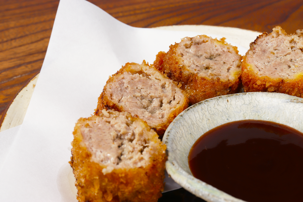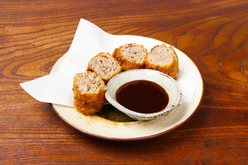 名物メニューのひとつが「鴨肉のメンチカツ」。俵型に成形した鴨肉のメンチカツを半分にカットし、もろみ味噌のディップと一緒にご提供されています。