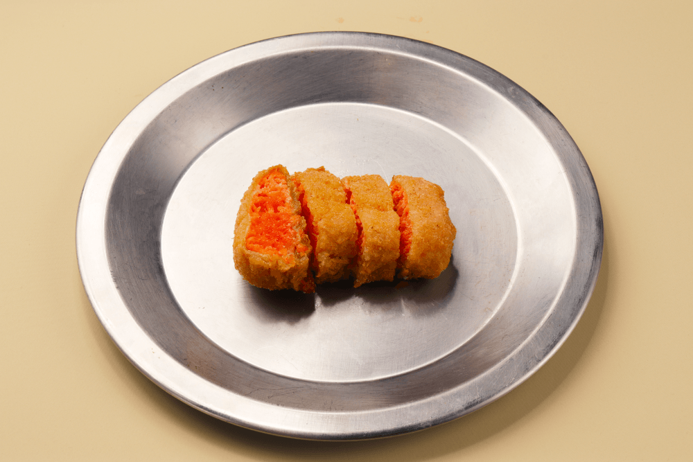 商品写真4枚目(1分30秒):外側が軽く揚がり、中はほぼ生の状態です。サーモンの食感を活かした、鮮度を感じさせる仕上がりです。