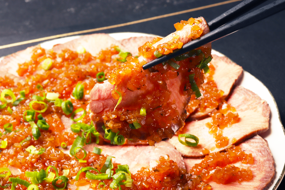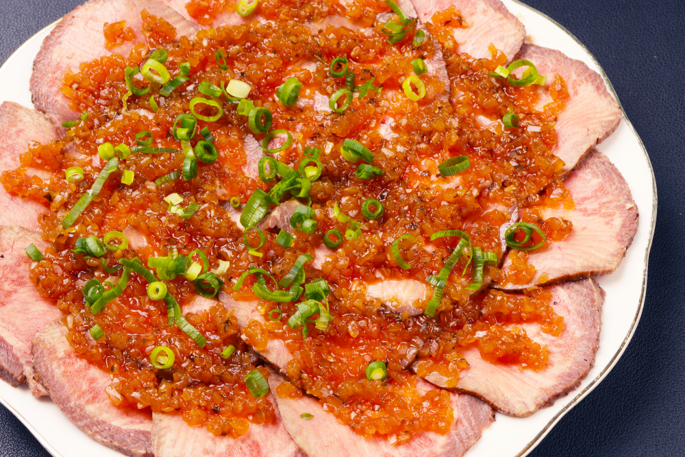 薄切りにした牛タンにわさびと玉ねぎのソースをかけ、香り豊かな味わいと滑らかな舌触りが特徴です。